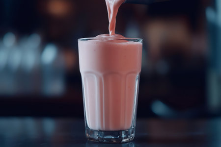 Pouring a vibrant pink vegan protein shake into a tall glass, creating a refreshing and healthy beverage on a stylish bar counter