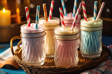 close-up of vintage milkshake glasses with striped straws, created with generative ai