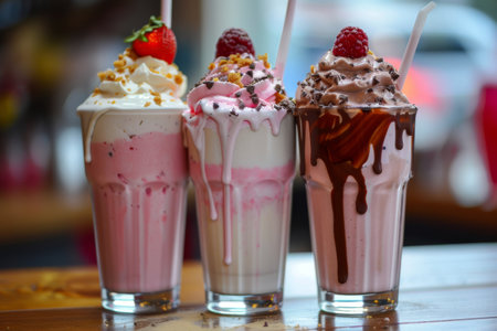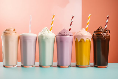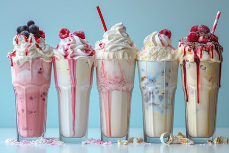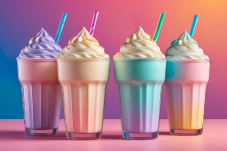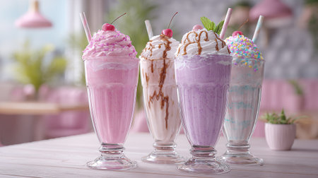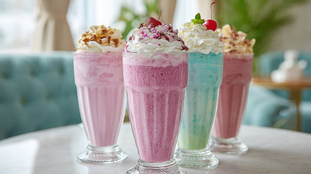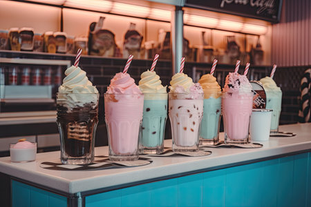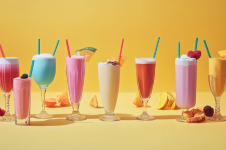 Enjoy a vibrant display of milkshakes and refreshing drinks served in tall glasses, perfect for a warm summer day.