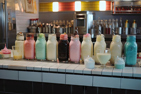 retro-themed milkshake bar, with a variety of flavors and toppings, created with generative ai