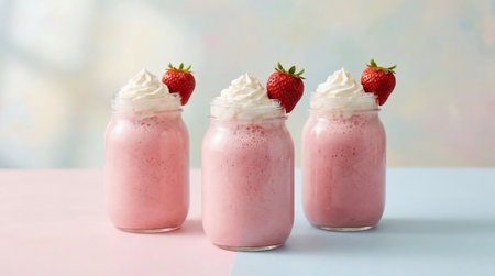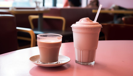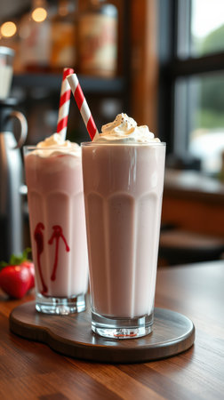 Milkshakes with whipped cream and strawberry drizzle served in a cozy cafe setting