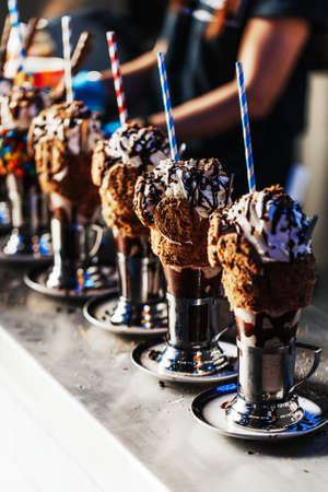Process of making extravagant and crazy milkshake. Special for kids. Insane dessert. Famous in America. Full of calories. Unhealthy food.