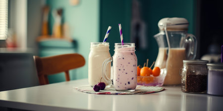 Milkshake with berries and fruits on the table in the kitchen. Generative AI