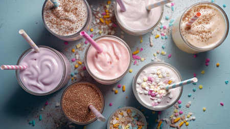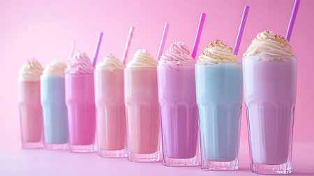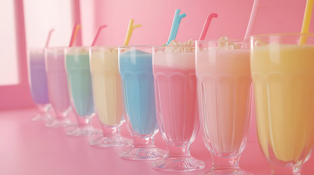 A vibrant array of colorful milkshakes showcasing sweetness and creativity in a playful setting.