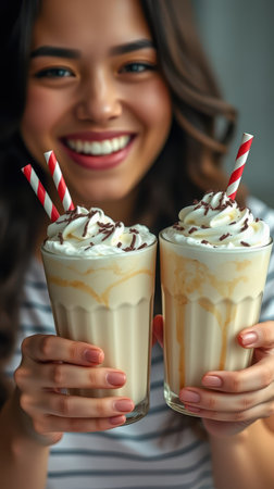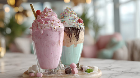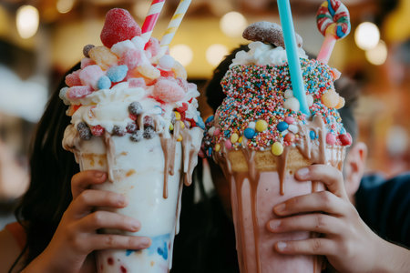 Enjoying refreshing milkshakes with whipped cream and chocolate syrup in a cozy cafe setting
