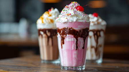 Indulgent Milkshakes: Three Decadent Treats Adorned with Toppings and Cherries on a Table