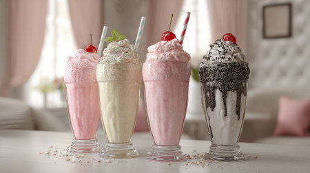 Four Decadent Milkshakes in Elegant Glasses: A Sweet Treat Display