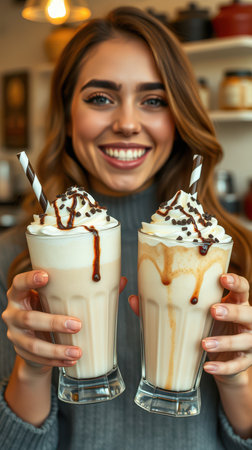 Smiling woman holding two delicious milkshakes with whipped cream and chocolate drizzle in a cozy cafe