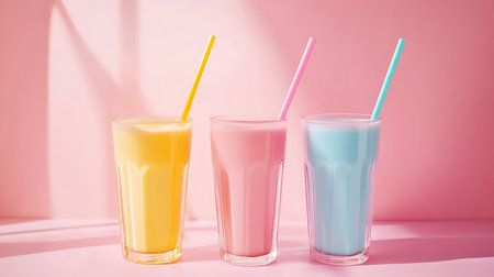 A delightful collection of milkshakes and fruity drinks stands tall against a vivid pink backdrop, perfect for summer enjoyment.