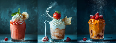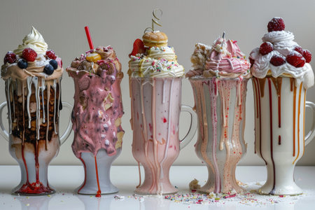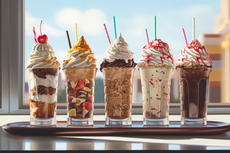 A collection of oversized milkshakes, milkshakes with nuts, caramel, strawberry and whipped cream, AI generated