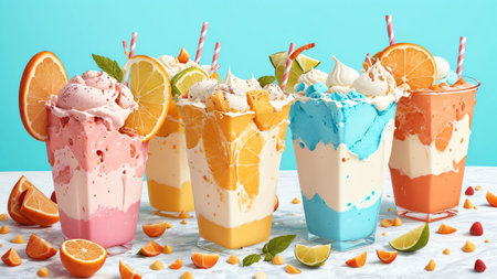 A vibrant display an array of drinks and milkshakes in tall glasses, perfect for a summer celebration or refreshing get-together.