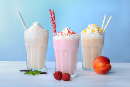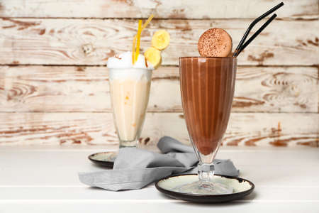 Delicious milkshakes on wooden background. Summer drink
