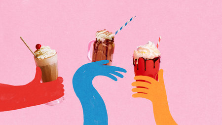 Pop-art collage of colorful cartoon hands holding three milkshakes on pink background