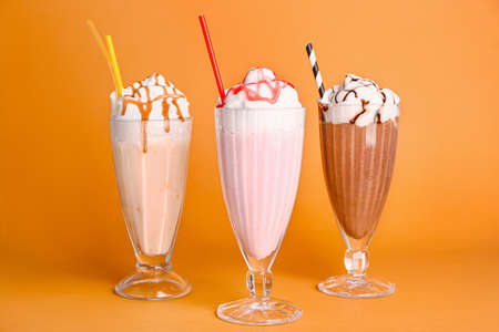 Generative ai. Different delicious freak shakes on color background. High quality illustration