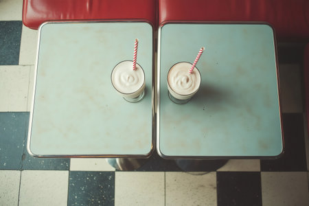 Two vanilla milkshakes with red striped straws sitting on a vintage diner table with red booth seats and checkered floor