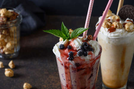 Delicious berry milkshake garnished with whipped cream, blueberries, dripping jam and mint on dark background. Close up.