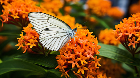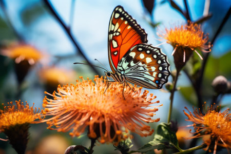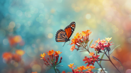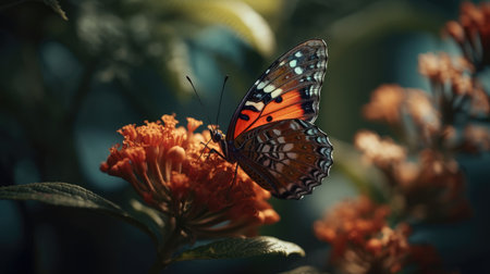 Vibrant monarch butterfly with orange flowers in lush garden. That the image is generated using AI.