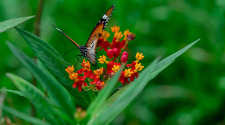 Beautiful orange, black and white plain tiger butterfly resting on a tropical milkweed plant