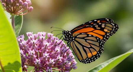 A beautiful, close-up photograph of a Monarch butterfly with its orange and black wings, perched on a cluster of pink milkweed flowers. The image captures the essential moment of the butterfly feeding on the nectar of its host plant, a vital part of its life cycle and migration.
