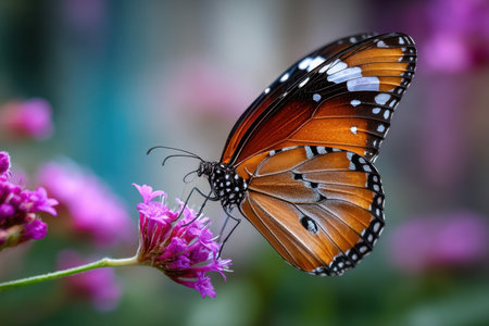 A stunning close-up of a monarch butterfly resting on a bright purple flower, capturing the intricate details of its orange wings against a vibrant garden backdrop.