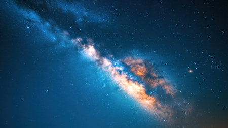 The majestic core of our galaxy, the Milky Way, glows with brilliant blue and orange hues, revealing countless stars and cosmic dust clouds in deep space.