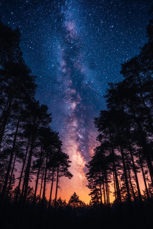 Milky Way over the forest with pine trees and starry sky