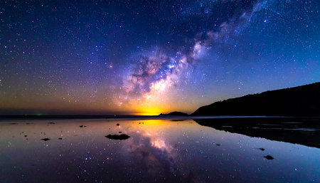 A breathtaking view of the Milky Way stretching across the night sky above a calm sea. The starry band of our galaxy is visible in all its glory. Suao, Yilan County, Taiwan.