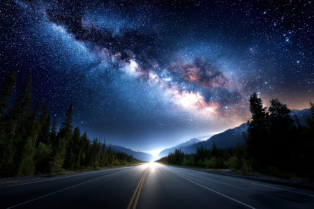 Generative AI : Night sky with milky way and stars Night road illuminated by car Light trails