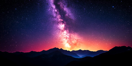 Majestic Milky Way Galaxy Over Silhouetted Mountain Range Night Sky Astrophotography Purple Pink Orange Hues Starry Landscape Nature Dark