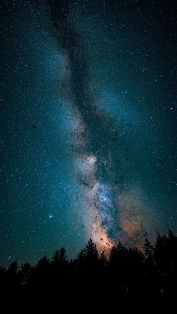 Captivating Milky Way galaxy above a dark forest. Concept for themes of exploration, natures wonder, and cosmic beauty. Ideal for backgrounds with ample copy space.