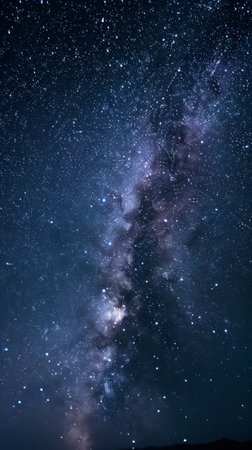 The majestic Milky Way galaxy stretches across the frame, a swirling band of stars, dust, and gas in shades of purple and blue. The dark expanse of space is dotted with countless tiny stars, creating a sense of immense depth and wonder. This image captures the beauty of our galaxy.
