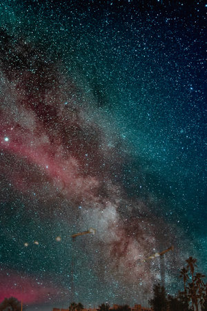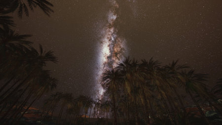 Starlit skies reveal the vibrant Milky Way stretching over a serene landscape of palm trees. This peaceful scene captures the beauty of nature in a quiet night setting.
