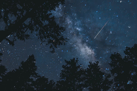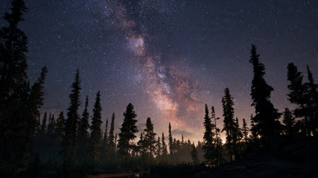 Captivating Milky Way galaxy above a dark forest. Concept for themes of exploration, natures wonder, and cosmic beauty. Ideal for backgrounds with ample copy space.