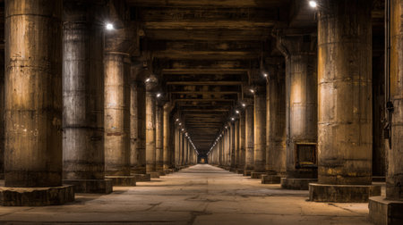 A captivating view of an underground industrial space featuring illuminated concrete columns, creating an eerie yet compelling atmosphere.