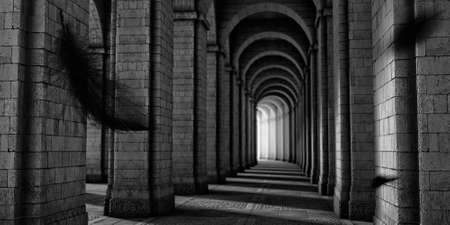 A long, dark corridor with arches and columns leading to a mysterious destination