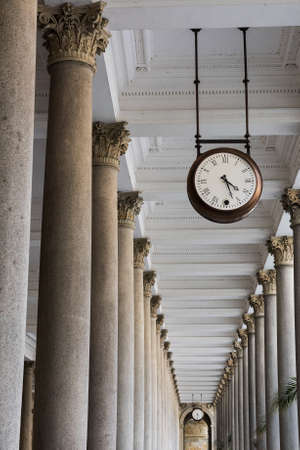 Perspective view of classical promenade with columns and clock(Karlovy Vary, Czech Republic)