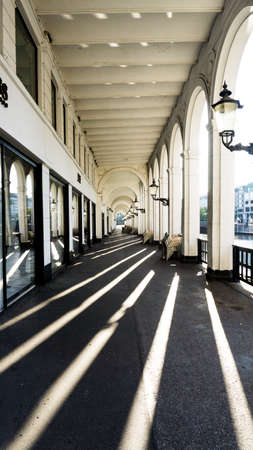 HAMBURG, GERMANY - June 22, 2019 alster arcades with sun shining through white columns