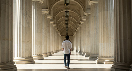 Architectural interior view featuring rows of fluted columns, creating a symmetrical perspective. Sunlight streams across the scene, highlighting the textures and forms, while deep shadows define the space. The composition suggests a historic or governmental setting, suitable for various editorial and commercial applications.