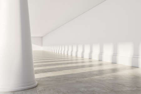 The sunlight shines through columns in a long and white corridor, industrial interior