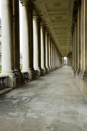Classical stone colonnade of a palace leading into distance