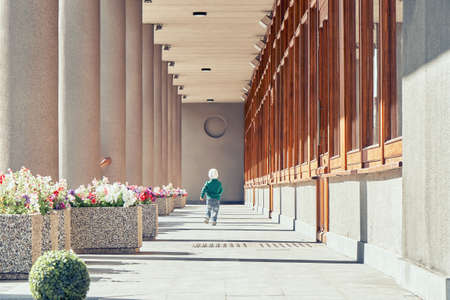 Happy little boy in stylish outfit runs along sunny gallery between columns row and building facade on spring day backside view