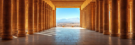 Ancient Egyptian Temple Hallway with Roman Columns and Distant Desert View in Morning Light