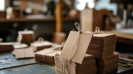 Explore a rustic crafting space featuring stacked blank tags tied with twine on a weathered wooden table, perfect for creative projects and organization.