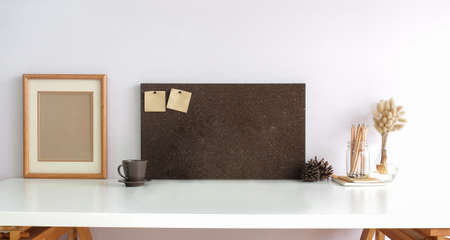Close up view of worktable with mock up notice board, stationery, camera, supplies and copy space in home office room