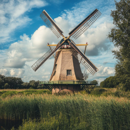 A stunning windmill nestled in lush greenery under a vibrant blue sky. This tranquil scene captures the essence of rural life and nature