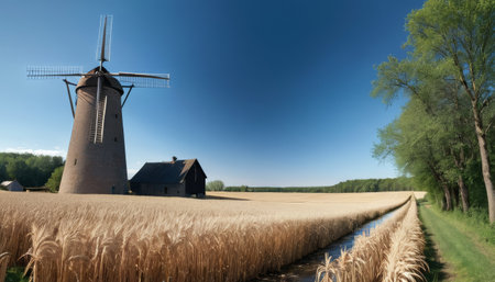A serene countryside windmill surrounded by golden wheat fields, a clear blue sky overhead, and soft clouds on the horizon. The peaceful and picturesque setting evokes rural charm.