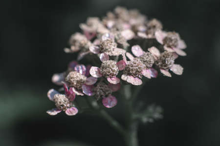 Macro photo of beautiful pink yarrow flower. Yarrow in dark green tint.