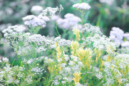 Medicinal plant yarrow, Achillea millefolium, white flowers close-up, selective focus.