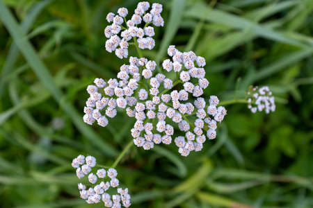 Common yarrow Achillea millefolium white flowers close up top view on green blurred grass floral background, selective focus. Medicinal wild herb Yarrow. medical plant concept.