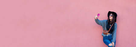 Panoramic banner, portrait of young confident hipster guy wearing denim jacket, round glasses and cap, isolated on background of lush lava color with copy space.